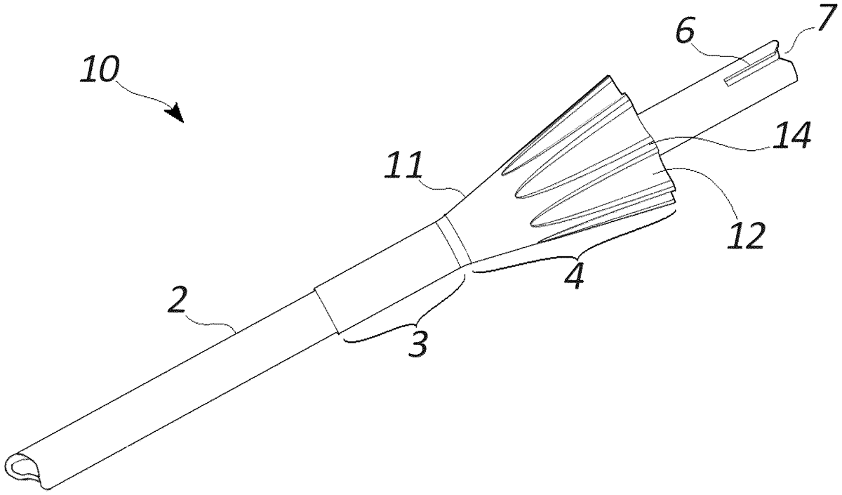 The patent describes a stabilizer for aerial projectiles featuring a conical portion with varying diameters and a tubular portion, designed to enhance stability during flight. The external surface of the conical portion incorporates a unique pattern of flutes and splines, and the stabilizer may be constructed from recycled plastic materials.