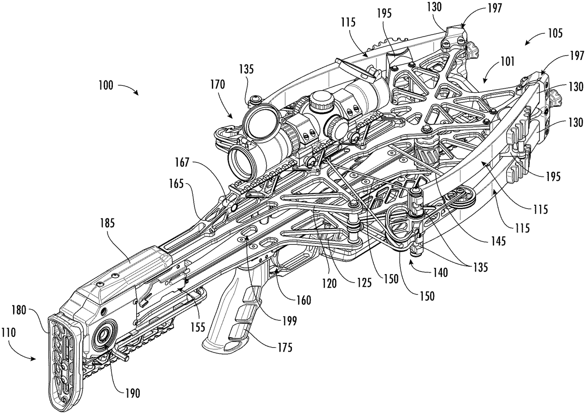 The patent describes a crossbow featuring two parallel plates that support upper and lower flexible limbs, with a pulley system and a draw string that transitions between released and drawn positions. Additionally, it includes a cocking mechanism and a trigger box that retains the draw string during operation, with distinct mounting locations for the limbs on each plate.