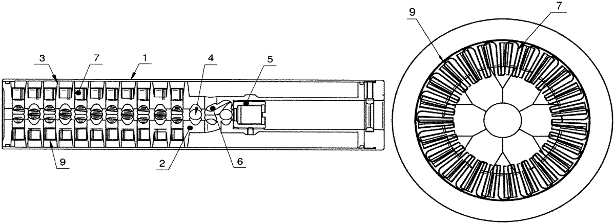 The invention discloses a hand guard connecting structure of a firearm, which has the advantages of simple structure, convenience in processing, quickness in disassembly and assembly, firmness in connection, reliability in positioning and good part assembly consistency. The utility model provides a hand protector section of thick bamboo connection structure of firearms, includes hand protector section of thick bamboo, lower case body, the polygon is personally submitted to hand protector section of thick bamboo transversal, is equipped with the rectangular channel on each face of hand protector section of thick bamboo respectively, still includes the connecting plate, the connecting plate is located the hand protector section of thick bamboo, and the lower surface of connecting plate is equipped with the boss, and the rectangular channel on boss and the hand protector section of thick bamboo bottom surface corresponds, and each boss joint is fixed in the rectangular channel that corresponds, is equipped with normal direction last screw hole on each boss respectively, it is equipped with down the screw hole to correspond on the case body down, and lower case body passes through screw, screw hole fixed connection with each boss, forms the fixed connection of hand protector section of thick bamboo, lower case body.