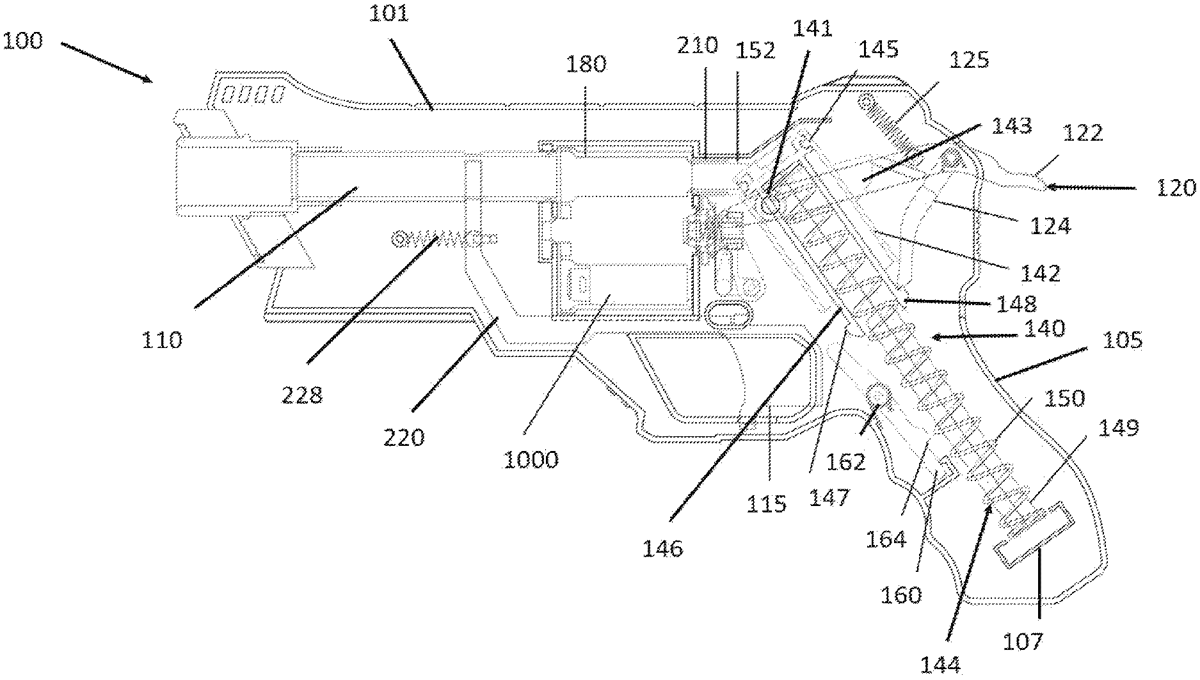 A toy projectile launcher including a housing, a launch barrel, an air piston assembly, a trigger, a trigger lever having a distal end portion connected to the launch barrel, a storage cylinder rotatably mounted within the housing and comprising a plurality of projectile holders, wherein each projectile holder is configured to contain a projectile, and a spring that biases the launch barrel away from the storage cylinder. When the trigger is actuated, the trigger lever pulls the launch barrel into engagement with one of the projectile holders of the storage cylinder to form an airtight seal between a rear portion of the launch barrel and the one of the projectile holders.