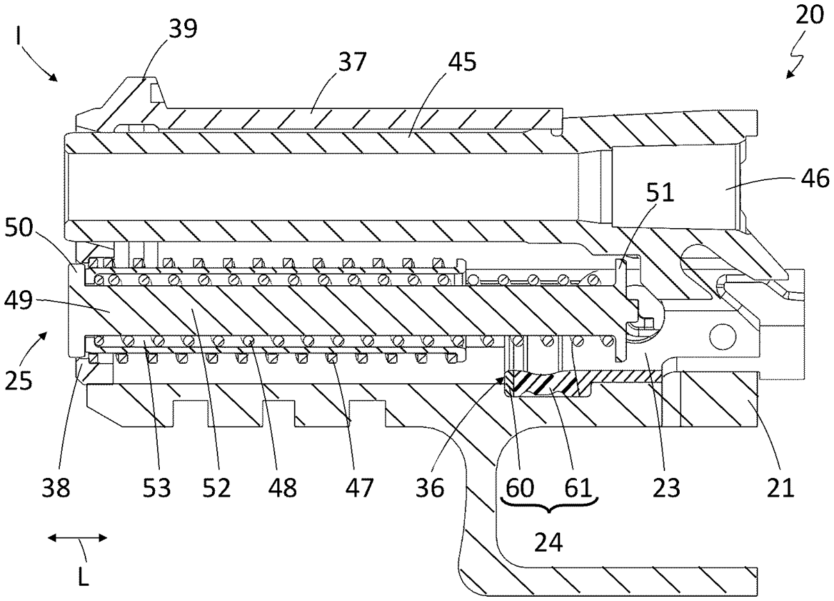 A hand-held gun having a grip part and a breech part movably supported in a longitudinal direction thereon is disclosed. A breech spring arrangement urges breech part in its initial position relative to grip part. For this purpose, breech spring arrangement is supported between the breech part and grip part. Starting from the initial position, breech part can move against the closing force of breech spring arrangement into an abutment position in which it abuts against a buffer body. Starting from the abutment position, breech part can be moved under elastic compression of buffer body in the longitudinal direction into a retracted position. In the movement area between the abutment position and the retracted position, a compression force is applied by the compressed buffer body in addition to the closing force of the breech spring arrangement between the grip part and the breech part.