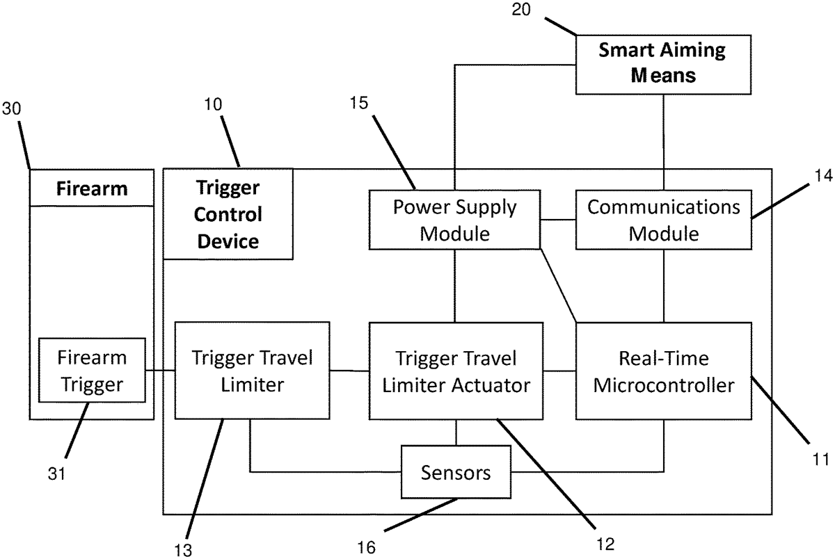 A firearm trigger control device, which is adapted to control the displacement of a firearm's trigger, such as to enable the discharge of a projectile upon receiving a firing signal (e.g., at a timing determined as optimal for hitting a designated target).