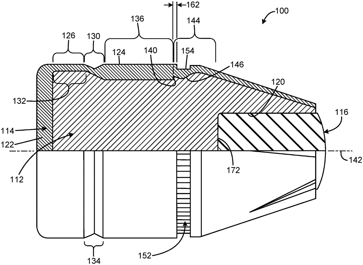 A bullet with controlled fragmentation has a core in the form of a generally cylindrical body having a forward end and a rear end and intermediate side portions extending there between, the forward end of the core defining a cavity, a jacket encompassing the rear end and at least selected portions of the sides of the core, the jacket having a sidewall having a first drive band portion having a first wall thickness, and a second portion immediately forward of the drive band portion having a second thickness less than the first thickness, the exterior of the jacket defining a cannelure groove encircling the bullet, and the cannelure groove being positioned forward of the first drive band portion. The drive band may have forward edge defining a step. The bullet of the present invention may also be received in the case mouth of a rimless case and be partially protruding therefrom.