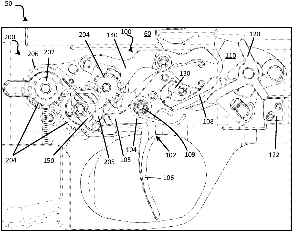 A machine gun comprising a gun housing; a rotor assembly positioned within the gun housing; a barrel cluster including a plurality of barrels extending forward from the rotor assembly; one or more vents providing a path for expulsion away from the rotor assembly of gases emanating from a cartridge chambered in one of the plurality of barrels; and one or more of a rotor lock mechanism, a feed mechanism, a delinking and transfer mechanism, a searing mechanism, a drive system, a self-contained hardware barrel clamp, a threaded adapter barrel clamp, integrated mounts, and/or multiple feed inlet locations.