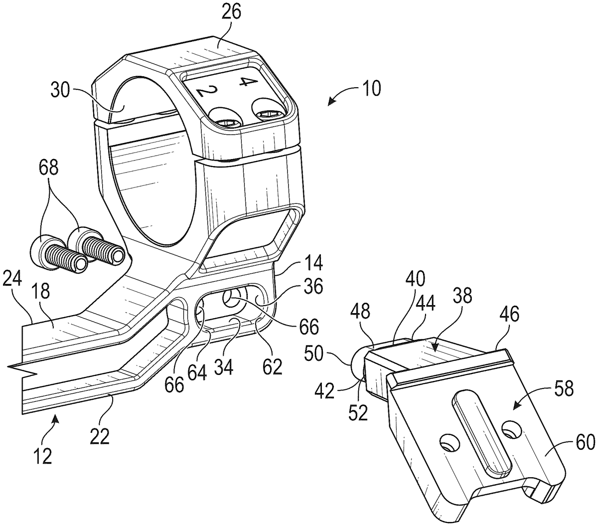 A firearm optic assembly has a body, the body having a first mounting facility configured to removably connect the body to the firearm, the body having a first receptacle configured to receive a first accessory, the body having a second mounting facility configured to removably receive a second mount portion associated with a second accessory offset from the medial plane, the second mounting facility including a pocket defined by one of the body and the second mount portion, the second mounting facility including a protrusion on the other of the body and the second mount portion, the protrusion being configured to be slidably or loosely received in the pocket, the protrusion having a free end and an opposed base end, the second mounting facility having an alignment facility including flared surfaces at the base end, and the flared surfaces being on opposing sides of the protrusion.