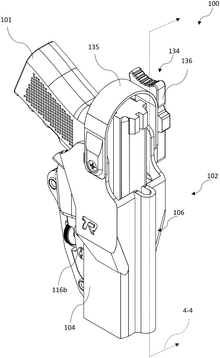 A holster includes a holster housing having an opening for inserting therethrough a weapon, a retention release lever including a shaft that has a pusher member and an inclined surface, and a holster retention tab pivotally coupled to the holster housing by a pivot element. The holster retention tab includes a catch, which lockingly engages an ejection port of the weapon when the weapon is inserted into the holster housing, and a force inclined surface. A biasing device is mounted in the holster housing to apply an urging force on the holster retention tab so as to retain the catch in the ejection port when the weapon is inserted into the holster housing. The inclined surface pushes against the force inclined surface, thereby creating a force vector that causes the holster retention tab to pivot about the pivot element and overcome the urging force of the biasing device and release the catch from the ejection port.