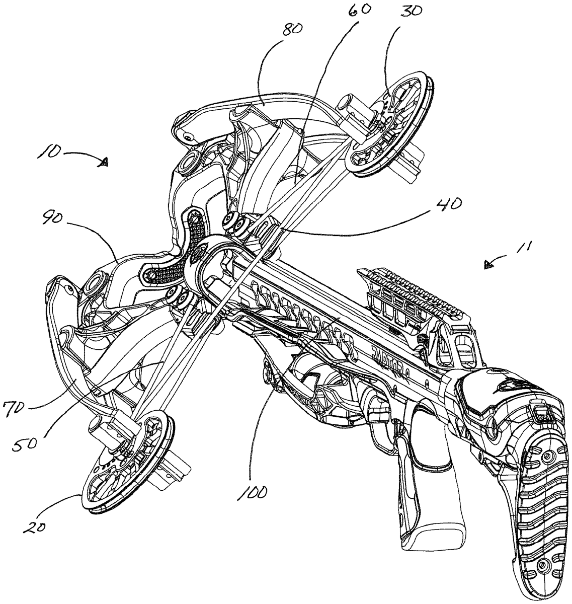 A crossbow having a crossbow frame and a bow assembly. The bow riser of the bow assembly having a launch deck surface and a bore below the launch deck surface. The crossbow frame having a launch deck surface and a coupling rod below the launch deck surface. The coupling rod is sized to cooperate with the bore, and the coupling rod is axial to and concentric with the bore. The bow riser is axially coupled to the crossbow frame by the coupling rod, the bow assembly has a first position for shooting a projectile and a second position for storage or transportation. Any suitable device may be used to lock the angular orientation between the bow assembly and the crossbow frame, such as pins, plungers, springs, detents and the like in the first and second positions.