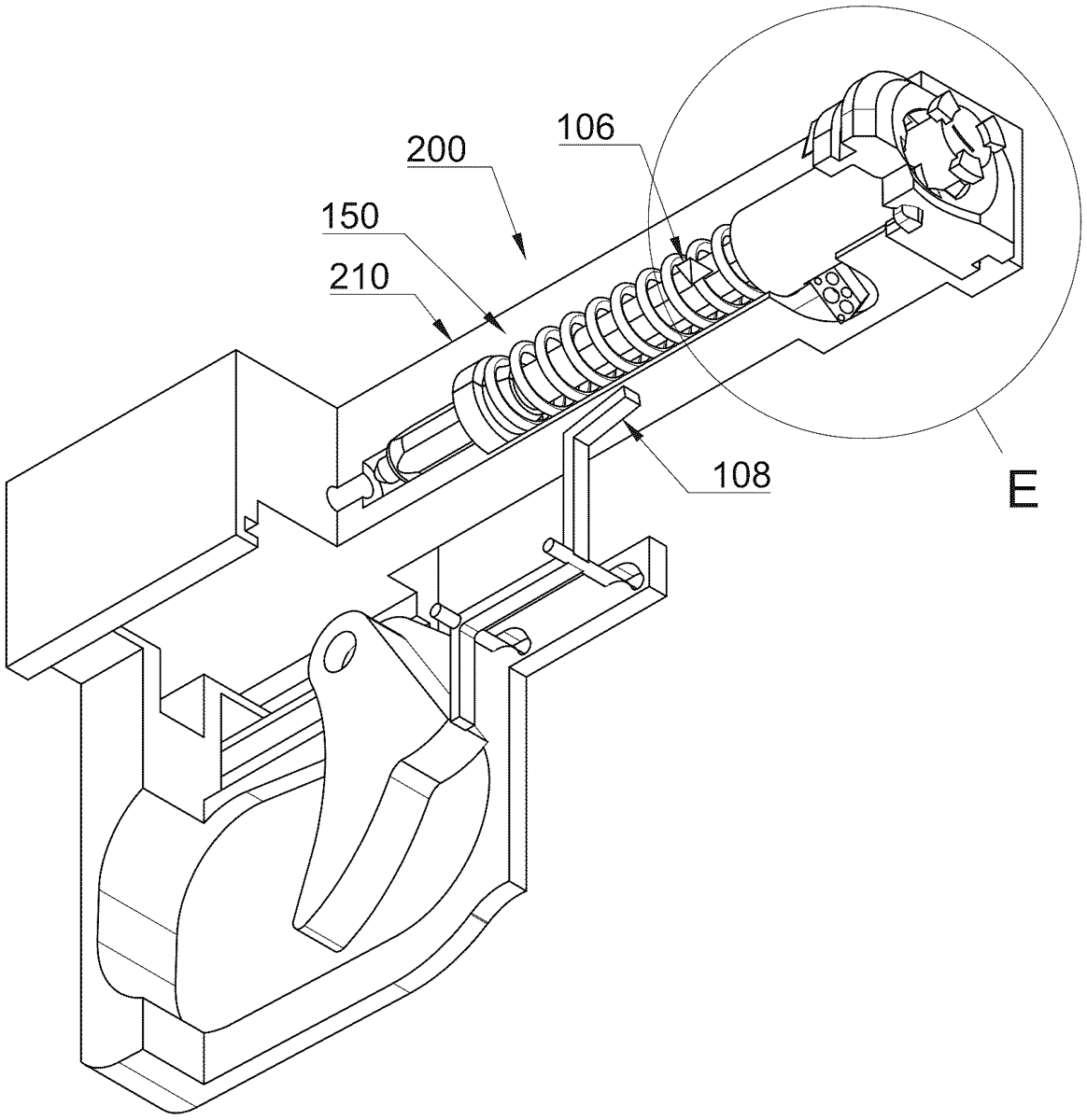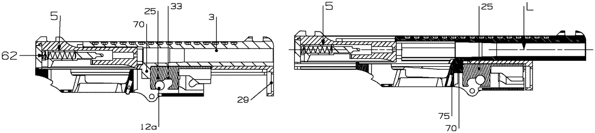 A firearm comprises a frame; a barrel; a hand grip; a breechblock slidable along the frame; a striker slidable in the breechblock; a longitudinal elastic device for the recovery of the recoil kinetic energy for rearming the striker; and a closing block for locking the breechblock in the closing position, the closing block having a body which extends longitudinally and having a rear wall engaged with a downward protrusion integral with the barrel, a front wall engageable with the breechblock and a longitudinal recess which opens at the front wall, where the longitudinal elastic device for the recovery of kinetic energy has a longitudinal rear portion housed in the recess and a longitudinal front portion retractable towards the inside of the recess, and is longitudinally interposed between a front stop abutment solidly constrained to the breechblock and a rear stop abutment solidly constrained to the frame.