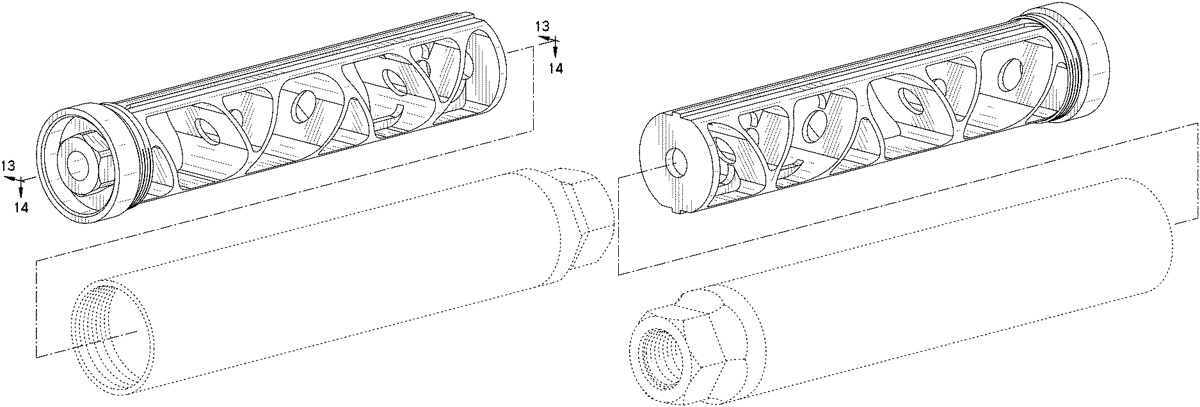 A suppressor for a firearm includes a housing, a cylindrical construct, and a structure. The cylindrical construct is disposed within the housing and surrounds a central pathway along a central axis of the suppressor. The cylindrical construct defines a plurality of apertures. The structure is disposed within the housing and surrounds the cylindrical construct. The structure extends along the central axis and includes a plurality of walls. The plurality of walls define a first fluid passage and a second fluid passage in fluid communication with the first fluid passage. At least one of the plurality of apertures is in fluid communication with the central pathway, the first fluid passage, and the second fluid passage.